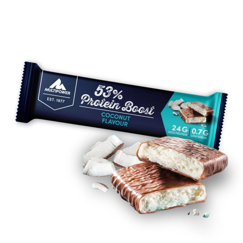 A Multipower új szintre emeli a sportteljesítményt a 53% Protein – Kókusz szelettel, amelyet azoknak a sportolóknak fejlesztettek ki, akik minden edzésből többet akarnak kihozni. Szeletenként 24 g fehérjével és egy modernizált recepttel ez a snack optimális támogatást nyújt az izomtömeg regenerálásához és fejlesztéséhez, miközben finom ízt és lágy, természetes kókuszaromájú állagot biztosít.