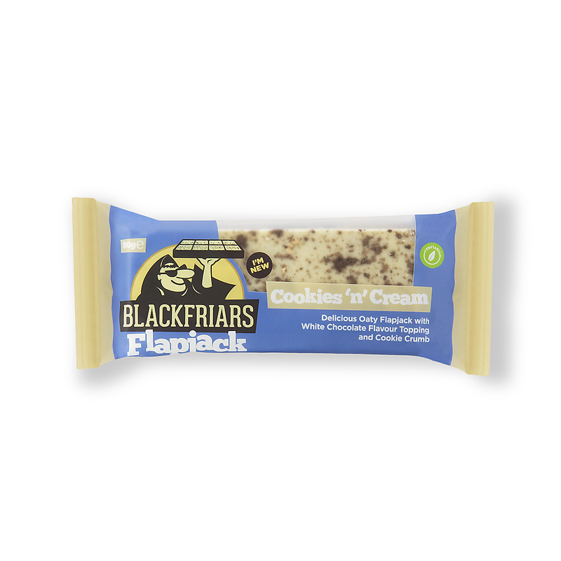 Zab Flapjack fehér csokoládé ízű bevonattal és keksz darabokkal. Alkalmas vegetáriánusoknak.