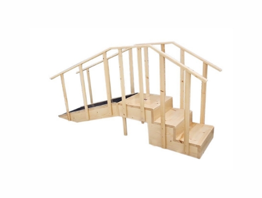 • Fenyőfából készült korlát A fa rámpát csúszásgátló gumi anyaggal borítják. Az emelkedési szög 24 fok. Méretek: 273 x 65 x 60 cm.