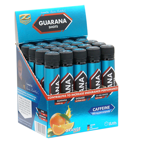A Guarana a Paulinia Cupana növény szárított és meghámozott magjaiból nyert kivonat. Eredetileg az Amazonas régióból származik. A helyiek hosszú ideig használták az éhségérzet és a fáradtság ellen. Ez az hatás a magokban található koffeintartalomnak köszönhető. A kávéval ellentétben, ahol a koffein szabad, a guaranában található koffein azonban a tanninokhoz kötődik. Ezért felszabadulása lassabb, és lehetővé teszi a hosszabb, tartósabb hatást. A Guarana 1,800 shots termékünkben a legjobb guarana minőséget használtuk magas koffeintartalom és legjobb íz eléréséhez. A folyékony forma lehetővé teszi a gyorsabb hatást a tabletták vagy kapszulákhoz képest, de anélkül, hogy károsítaná a hosszabb távú hatást. 1,800 mg erősen koncentrált guarana kivonattal az egyik legmagasabb dózist kapja a piacon. 180 mg koffein hosszabb távú hatása 2-3 csésze szűrt kávénak felel meg.