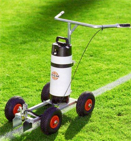 Nedves pályajelölő kocsi, FM704 típus, 10 literes műanyag tartállyal és kézi műanyag pumpával felszerelve.A szórófej a kezelő látóterében helyezkedik el, magassága állítható, és kényelmesen vezérelhető a vezetőrúdon lévő karral. A pumpa automatikusan leáll, amikor a kart elengedik. A vonal szélessége rugalmasan állítható 50–120 mm között.
